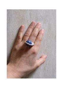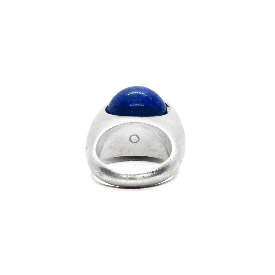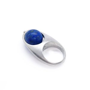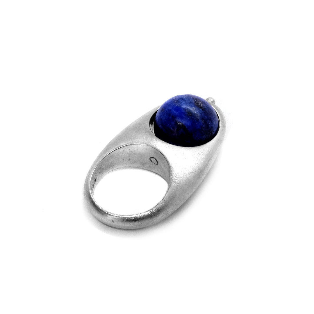 Anillo hecho a mano en plata 950 mediante técnica de cera perdida. La perla de lapislázuli que lo corona, ha sido remachada con un pasador de plata permitiendo de esta forma que gire sobre su eje al tocarla.