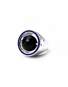 Anillo hecho a mano en plata 950. El borde de la pieza está decorado con lapislázuli reconstituido, enmarcando en el centro una perla de ónix, fijada con un pasador de plata remachado. Gracias a este sistema de sujeción, la perla puede girar sobre su eje al ser tocada.